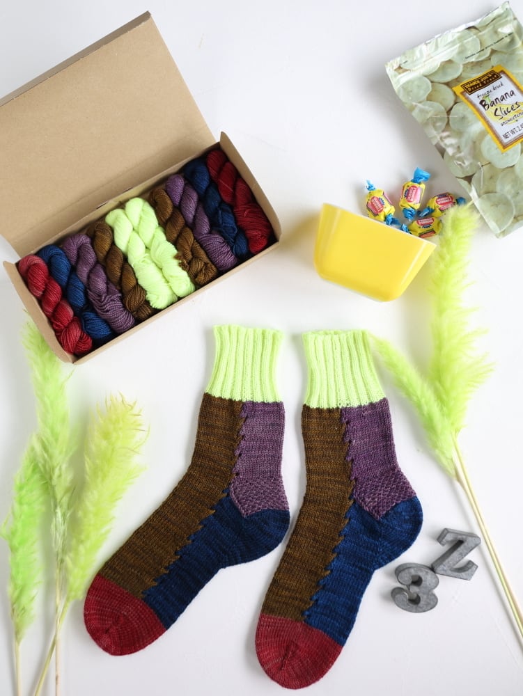 次々と変わる色に編む手が進む、 五色のカノンソックス。